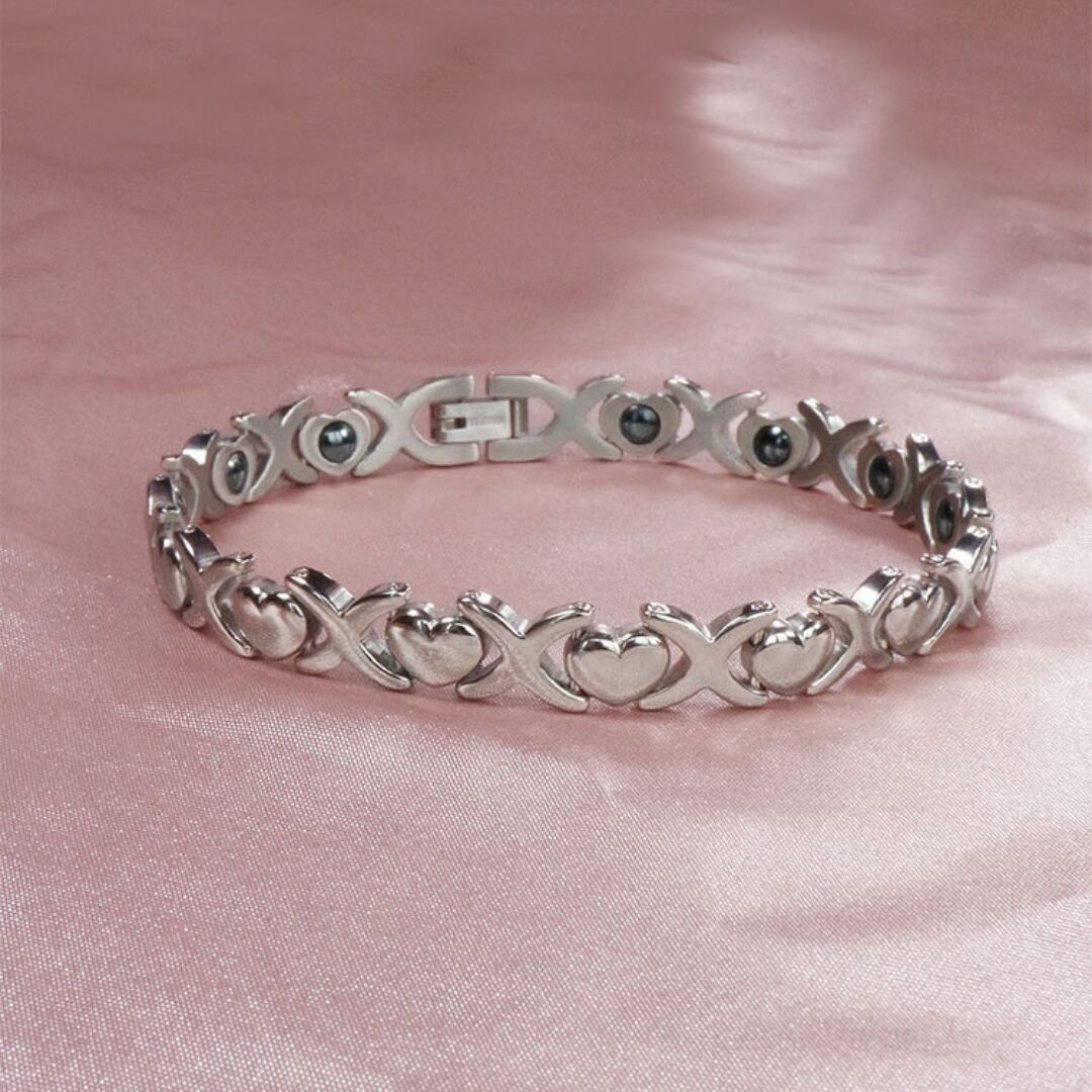 エレガントなデザインのゲルマニウムストーン ハート純チタンブレスレットは、体にやさしいゲルマニウムと純チタンを使用したこだわりの逸品です。シルバーの美しい輝きが手元を華やかに彩ります。